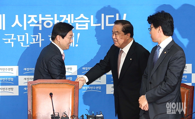 1일, 서울 여의도 국회에서 비선실세국정농단 진상조사단 1차 회의 직전, 문희상 비상대책위원장(사진 가운데)과 박 조사단장이 악수를 나누고 있다.