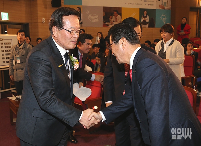 서울 여의도 국회 의원회관에서 1일 오후 열린 '1회 국회의장배 중-고교생 스피치 및 토론회 결선대회' 직전, 정의화 국회의장(사진 왼쪽)이 관계자와 악수를 나누고 있다.