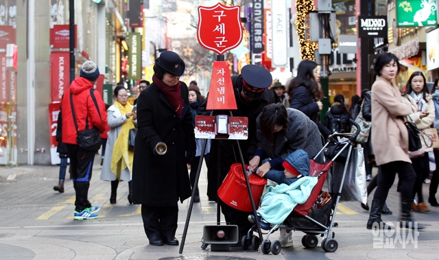 구세군 자선냄비 모금이 시작된 1일 서울 명동거리에 설치된 구세군 자선냄비에 한 아이가 엄마와 함께 성금을 기부하고 있다. 구세군은 올해 31일까지 전국 76개 지역 360여 곳에 자선냄비를 설치해 모금활동을 벌인다.