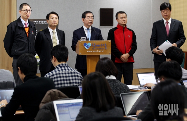 박원순 서울시장(가운데)이 2일 서울시청 브리핑룸에서 민선 6기 인사혁신방안 발표를 마친 뒤 취재진의 질문에 답하고 있다.