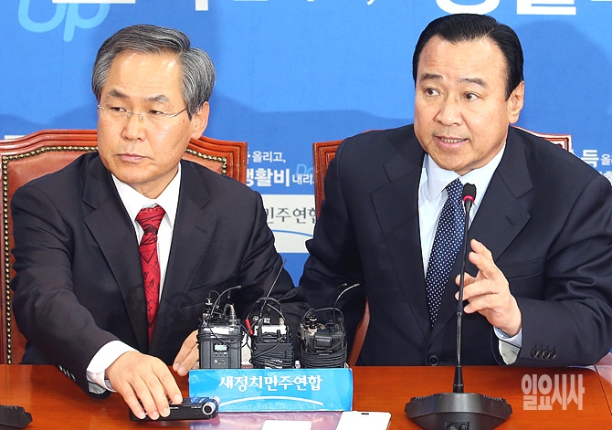2일 오전, 서울 여의도 국회에서 새누리당 이완구(사진 왼쪽)-새정치민주연합 우윤근 원내대표가 주례회동을 갖고 있다.