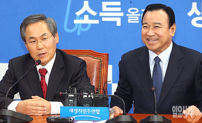 2일 오전, 서울 여의도 국회에서 새누리당 이완구-새정치민주연합 우윤근 원내대표가 주례회동 도중 웃음 짓고 있다.