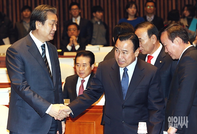 2일, 서울 여의도 국회에서 열린 새누리당 의원총회 직전, 김무성 대표(사진 왼쪽)와 이완구 원내대표가 악수를 나누고 있다.