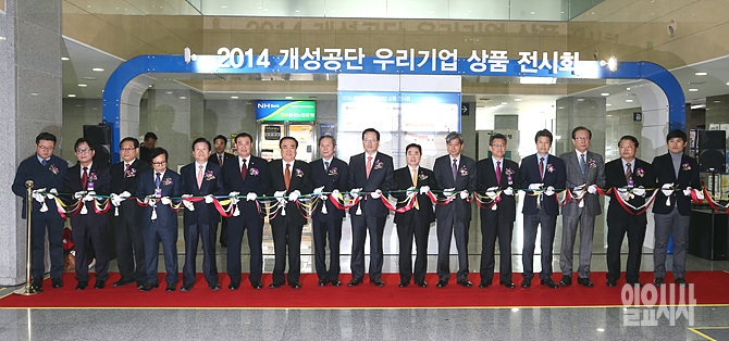 2일, 북한 개성공단에 진출한 14개 중소기업들의 '개성공단 우리기업 상품전시 및 판매전' 직전, 정의화 국회의장(사진 가운데), 문희상 새정치민주연합 비상대책위원장 등이 참석해 테이프 커팅식을 하고 있다. <사진=국회>