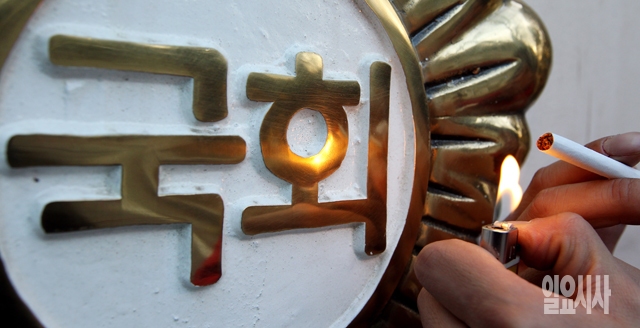 담뱃값 2000원 인상 관련 법안이 2일 국회 본회의에서 통과될 것으로 전망된 가운데 이날 서울 여의도 국회 앞에서 한 시민이 담배를 피고 있다.