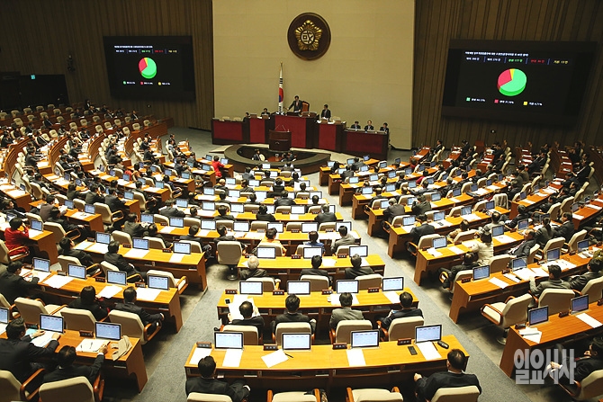 여야는 2일 오후, 서울 여의도 국회 본회의장에서 본회의를 열고 재석 276명 중 찬성 177명, 반대 86명, 기권 13명으로 가결처리시키고 있다.