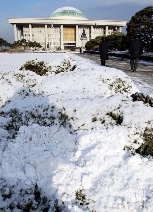 3일 서울 여의도 국회 경내에 밤새 내린 눈이 쌓여있는 가운데 직원들이 눈길을 따라 출근하고 있다.