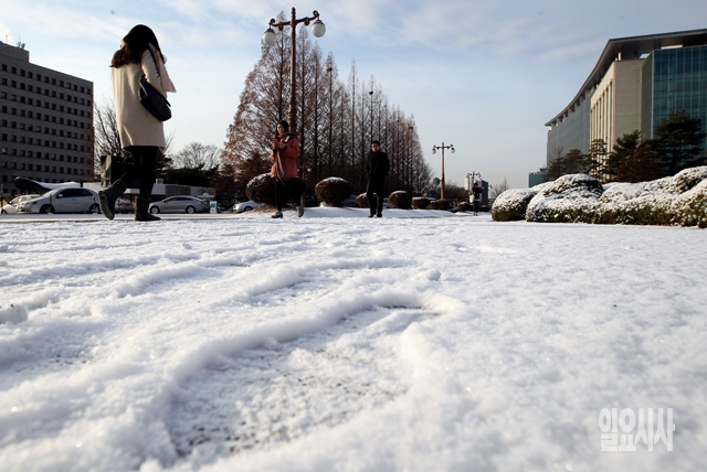 3일 서울 여의도 국회 경내에 밤새 내린 눈이 쌓여있는 가운데 직원들이 눈길을 따라 출근하고 있다.
