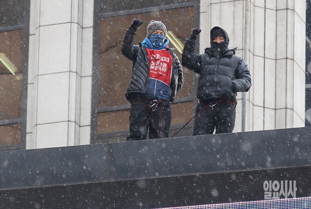 [포토] 눈보라 속 씨앤앰 해고자 고공농성