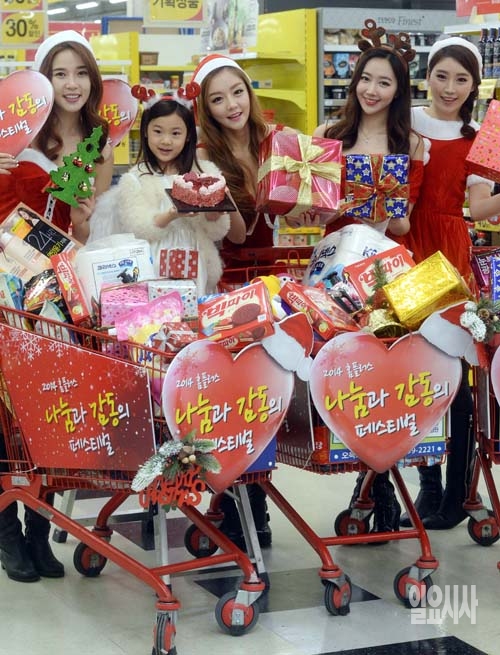 3일 서울 홈플러스 영등포점에서 산타 복장의 모델들이 '나눔과 감동의 페스티벌'을 알리고 있다. 홈플러스는 4일부터 31일까지 역대 연말 시즌 최대 규모의 행사를 통해 생필품과 패션 잡화 등을 최대 50% 할인 판매, 행사 상품 매출액 일부를 소아암 어린이와 유방암 환자 치료 지원하기 위해 기부한다.