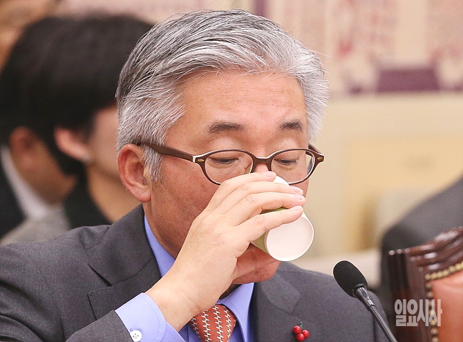 3일, 서울 여의도 국회 교육문화체육관광위원회 회의실에서 열린 전체회의 도중 김종덕 문체부장관이 목이 타는 듯 물을 들이키고 있다.