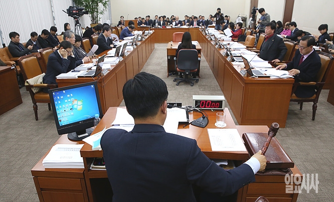 김춘진 국회 보건복지위원장(사진 가운데)이 4일, 서울 여의도 국회 보건복지위원회 회의실에서 열린 전체회의에서 법안을 의결하고 있다.