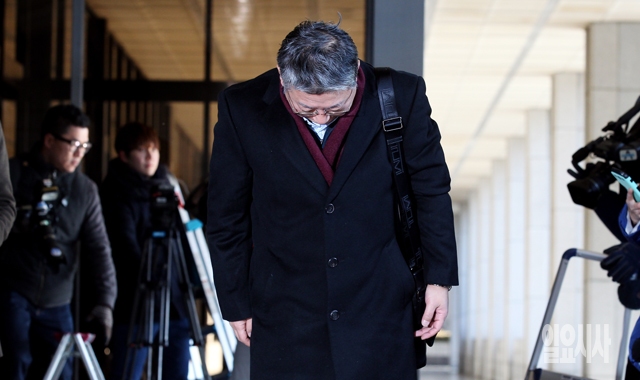 조응천 전 청와대 공직기강비서관이 5일 서울 서초동 서울중앙지검에 청와대 내 문건 유출과 관련해 조사를 받기 위해 들어서며 고개 숙여 인사를 하고 있다.