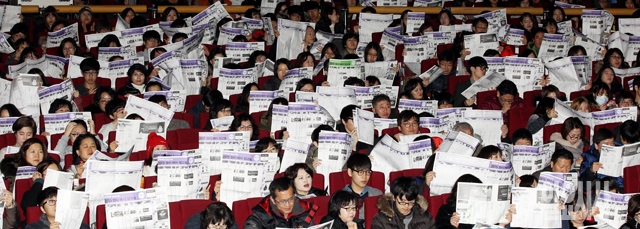 5일 서울 건국대학교 새천년기념관에서 유웨이중앙교육 주최로 열린 '2015 정시 입시전략 설명회'에서 학부모와 수험생들이 배치표를 보고 있다.