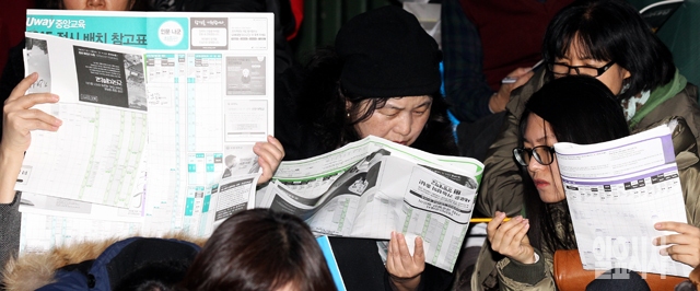 5일 서울 건국대학교 새천년기념관에서 유웨이중앙교육 주최로 열린 '2015 정시 입시전략 설명회'에서 학부모와 수험생들이 배치표를 보고 있다.