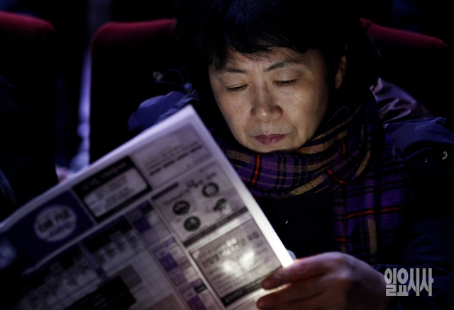 5일 서울 건국대학교 새천년기념관에서 유웨이중앙교육 주최로 열린 '2015 정시 입시전략 설명회'에서 한 학부모가 배치표를 보고 있다.