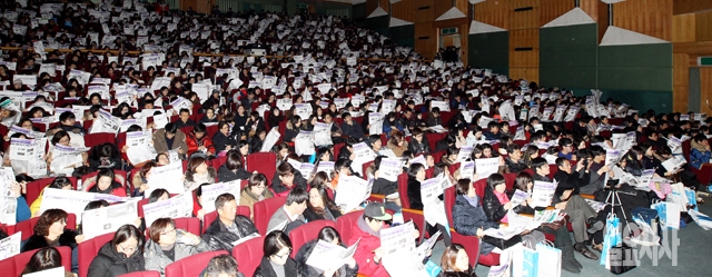 5일 서울 건국대학교 새천년기념관에서 유웨이중앙교육 주최로 열린 '2015 정시 입시전략 설명회'에서 학부모와 수험생들이 배치표를 보고 있다.