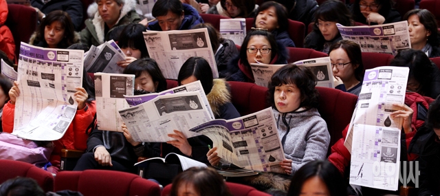 5일 서울 건국대학교 새천년기념관에서 유웨이중앙교육 주최로 열린 '2015 정시 입시전략 설명회'에서 학부모와 수험생들이 배치표를 보고 있다.
