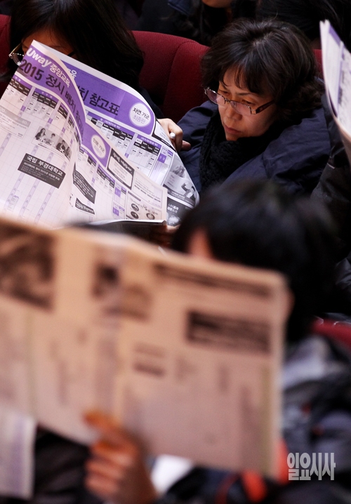 5일 서울 건국대학교 새천년기념관에서 유웨이중앙교육 주최로 열린 '2015 정시 입시전략 설명회'에서 학부모와 수험생들이 배치표를 보고 있다.