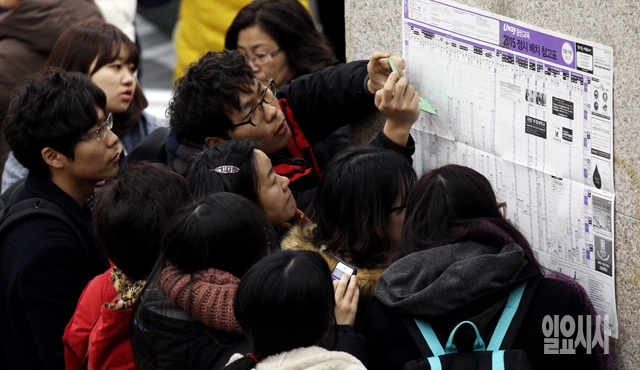 5일 서울 건국대학교 새천년기념관에서 유웨이중앙교육 주최로 열린 '2015 정시 입시전략 설명회'에서 학부모와 수험생들이 배치표를 보고 있다.
