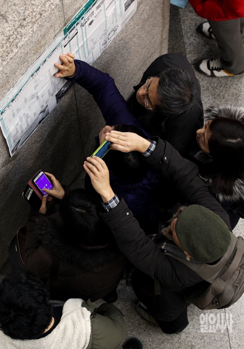 5일 서울 건국대학교 새천년기념관에서 유웨이중앙교육 주최로 열린 '2015 정시 입시전략 설명회'에서 학부모와 수험생들이 배치표를 보고 있다.