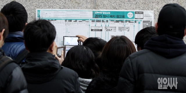 5일 서울 건국대학교 새천년기념관에서 유웨이중앙교육 주최로 열린 '2015 정시 입시전략 설명회'에서 학부모와 수험생들이 배치표를 보고 있다.