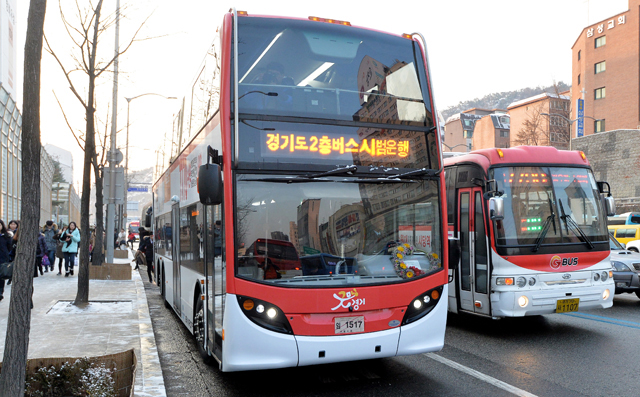 수원역~사당역 구간을 운행하는 7770번 광역 2층버스가 8일 서울 동작구 사당역 정류소로 들어서고 있다. 2층 버스는 이날 7770번 버스를 시작으로 김포~서울역, 남양주~잠실 노선 순으로 각각 일주일씩 시범운행한다.