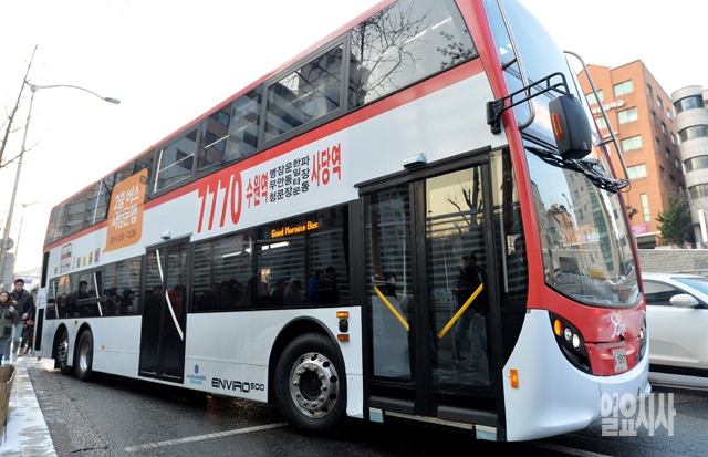 수원역~사당역 구간을 운행하는 7770번 광역 2층버스가 8일 서울 동작구 사당역 정류소로 들어서고 있다. 2층 버스는 이날 7770번 버스를 시작으로 김포~서울역, 남양주~잠실 노선 순으로 각각 일주일씩 시범운행한다.