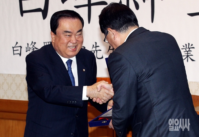 새정치민주연합 문희상 비상대책위원장(왼쪽)이 8일 서울 여의도 국회 귀빈식당에서 백봉라용균선생기념사업회 주최로 열린 '제16회 백봉신사상 시상식'에서 정의화 국회의장으로부터 대상을 전달받고 있다.