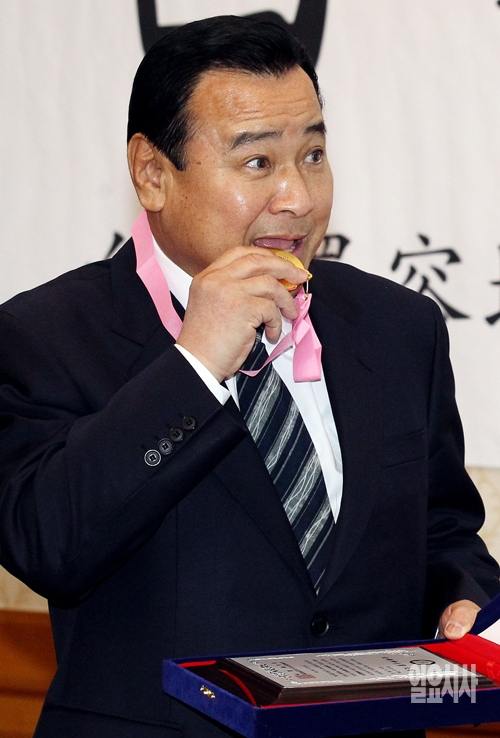 새누리당 이완구 원내대표가 8일 서울 여의도 국회 귀빈식당에서 백봉라용균선생기념사업회 주최로 열린 '제16회 백봉신사상 시상식'에서 메달을 물고 있다.
