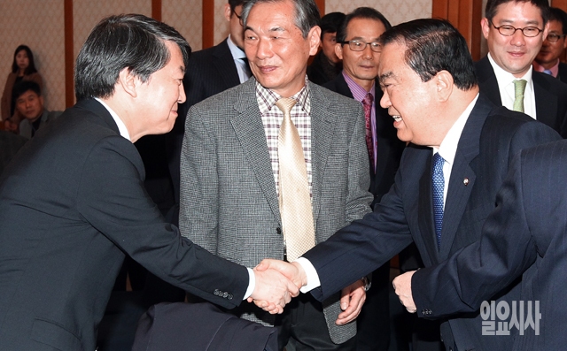새정치민주연합 문희상 비상대책위원장(오른쪽)과 안철수 의원이 8일 서울 여의도 국회 귀빈식당에서 백봉라용균선생기념사업회 주최로 열린 '제16회 백봉신사상 시상식'에서 악수하고 있다.