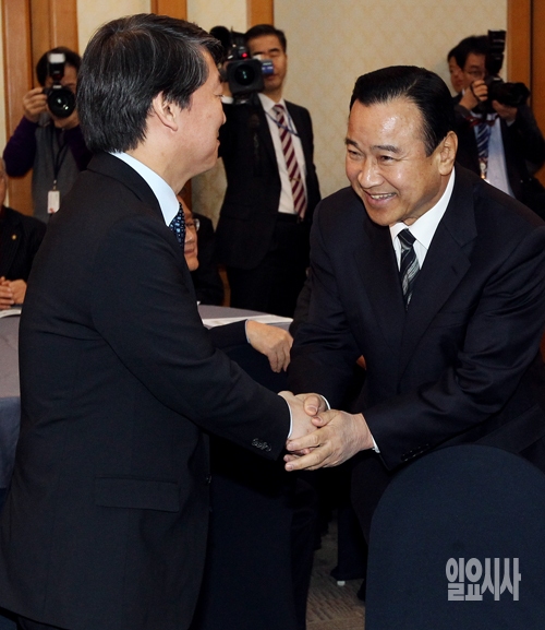 새누리당 이완구 원내대표(오른쪽)와 새정치민주연합 안철수 의원이 8일 서울 여의도 국회 귀빈식당에서 백봉라용균선생기념사업회 주최로 열린 '제16회 백봉신사상 시상식'에서 악수하고 있다.