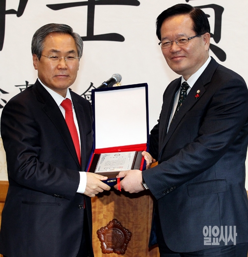 새정치민주연합 우윤근 원내대표(왼쪽)가 8일 서울 여의도 국회 귀빈식당에서 백봉라용균선생기념사업회 주최로 열린 '제16회 백봉신사상 시상식'에서 정의화 국회의장으로부터 상장을 전달받고 있다.