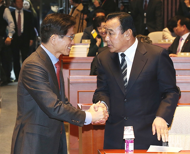서울 여의도 국회 예결위 회의장에서 8일, 김문수 새누리당 보수혁신 특별위원회 위원장(사진 왼쪽)이 회의에 참석한 가운데 막 입장을 마친 이완구 원내대표와 악수를 나누고 있다.
