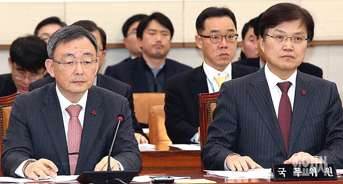8일, 서울 여의도 국회 법사위원회 회의실에서 열린 전체회의에서 최양희 미래부장관(사진 오른쪽)과 최성준 방통위원장이 출석해 있다.