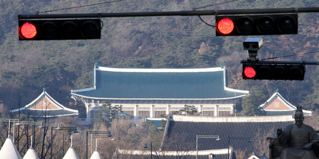 비선실세 의혹을 받고 있는 정윤회 씨의 검찰 조사가 이틀 앞으로 다가온 가운데 8일 광화문 네거리에 켜진 빨간 신호등 너머로 청와대가 보이고 있다.