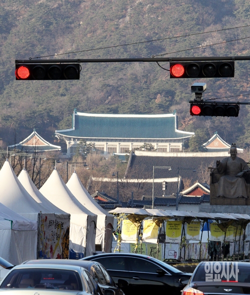 비선실세 의혹을 받고 있는 정윤회 씨의 검찰 조사가 이틀 앞으로 다가온 가운데 8일 광화문 네거리에 켜진 빨간 신호등 너머로 청와대가 보이고 있다.