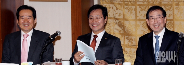 9일 서울 중구 프레스센터에서 열린 '새정치민주연합 서울시당-서울시 조찬간담회'에서 박원순 서울시장(오른쪽부터), 오영식 서울시당위원장, 정세균 종로구지역위원장이 담소를 나누며 미소 짓고 있다.