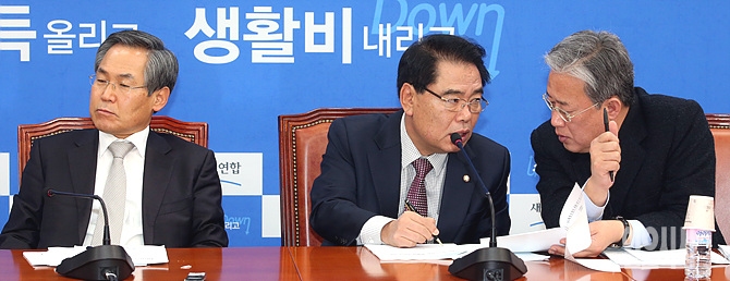 9일, 서울 여의도 국회에서 열린 새정치민주연합 원내대책회의서 백재현 정책위의장(사진 가운데)이 유성엽 정책위 수석부의장(사진 오른쪽)과 이야기를 나누고 있다.