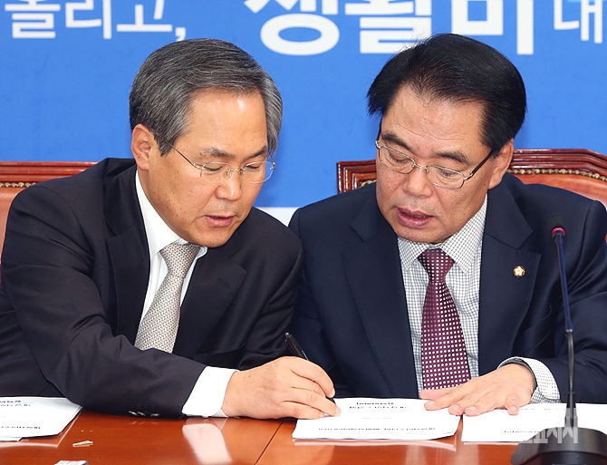 9일, 서울 여의도 국회에서 열린 새정치민주연합 원내대책회의서 우윤근 원내대표(사진 왼쪽)가 백재현 정책위의장과 이야기를 나누며 자료를 체크하고 있다.