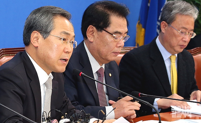 9일, 서울 여의도 국회에서 열린 새정치민주연합 원내대책회의서 우윤근 원내대표가 발언하고 있다.