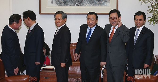 9일, 새누리당 이완구(사진 오른쪽서 세 번째)-새정치민주연합 우윤근 원내대표(사진 왼쪽서 세 번째), 주호영 새누리당 정책위의장(사진 오른쪽서 두 번째), 안규백 새정치민주연합 원내수석부대표(사진 오른쪽) 등이 서울 여의도 국회에서 열린 여야 원내지도부 주례회동 직전, 기념촬영을 위해 잠시 포즈를 취하고 있다.