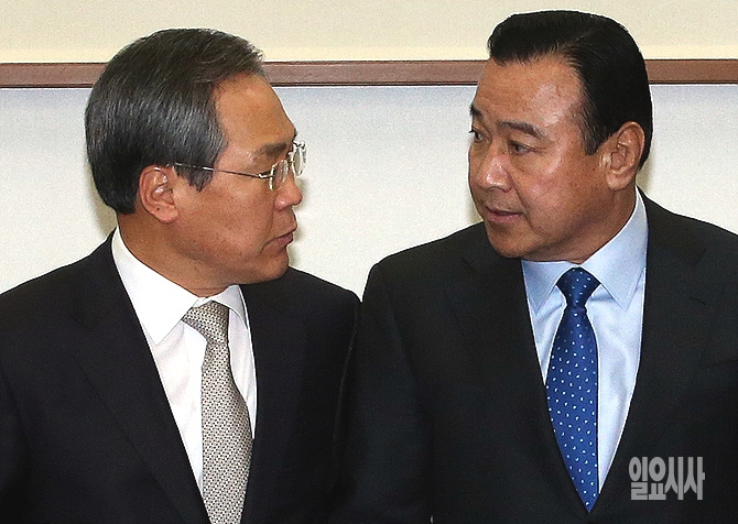 9일, 새누리당 이완구(사진 오른쪽)-새정치민주연합 우윤근 원내대표가 서울 여의도 국회에서 열린 여야 원내지도부 주례회동 직전, 기싸움하듯 서로를 쳐다보고 있다.