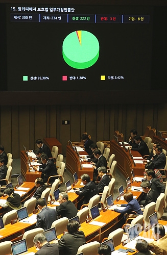 9일, 서울 여의도 국회 본회의장에서 열린 본회의에서 '범죄피해자 보호법 일부개정안'이 재적 234석, 찬성 223석, 반대 3석, 기권 8석으로 가결처리되고 있다.