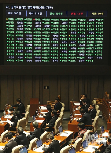 9일, 서울 여의도 국회 본회의장에서 열린 본회의에서 공직자윤리법 일부개정법률안(대안)이 재석 218석, 찬성 196석, 반대 12석, 기권 10석으로 가결처리되고 있다.
