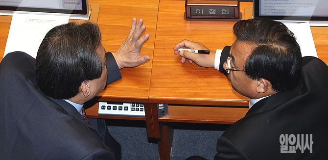 9일, 서울 여의도 국회 본회의장에서 열린 본회의에서 김무성 새누리당 대표(사진 왼쪽)와 이정현 의원이 이야기를 나누고 있다.