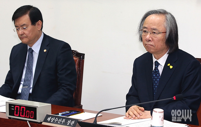 9일, 서울 여의도 국회에서 열린 국민안전특별혁신위원회 전체회의에 이주영 해양수산부장관(사진 오른쪽)이 의원들의 질의를 들으며 입을 꾹 다물고 있다.