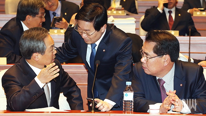 9일, 서울 여의도 국회에서 열린 새정치민주연합 의원총회에서 우윤근 원내대표(사진 왼쪽)-백재현 사무총장(사진 오른쪽)-박범계 원내대변인이 이야기를 나누고 있다.