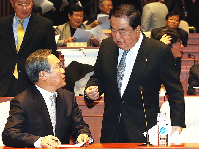 9일, 서울 여의도 국회에서 열린 새정치민주연합 의원총회에서 문희상 비대위원장(사진 오른쪽)과 우윤근 원내대표가 이야기를 나누고 있다.