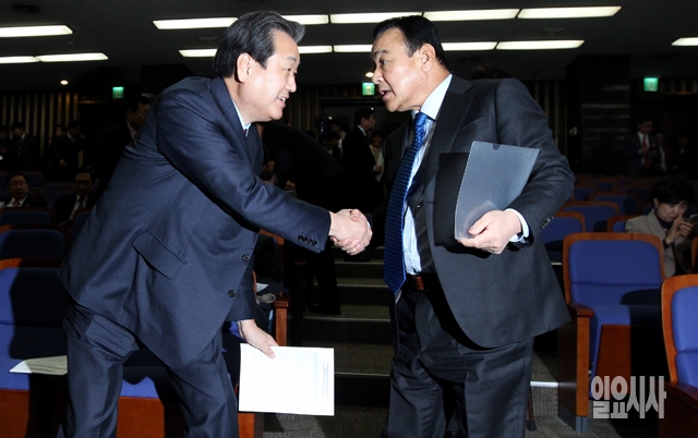 새누리당 김무성 대표(왼쪽)와 이완구 원내대표가 9일 서울 여의도 국회에서 열린 의원총회에서 악수하고 있다.